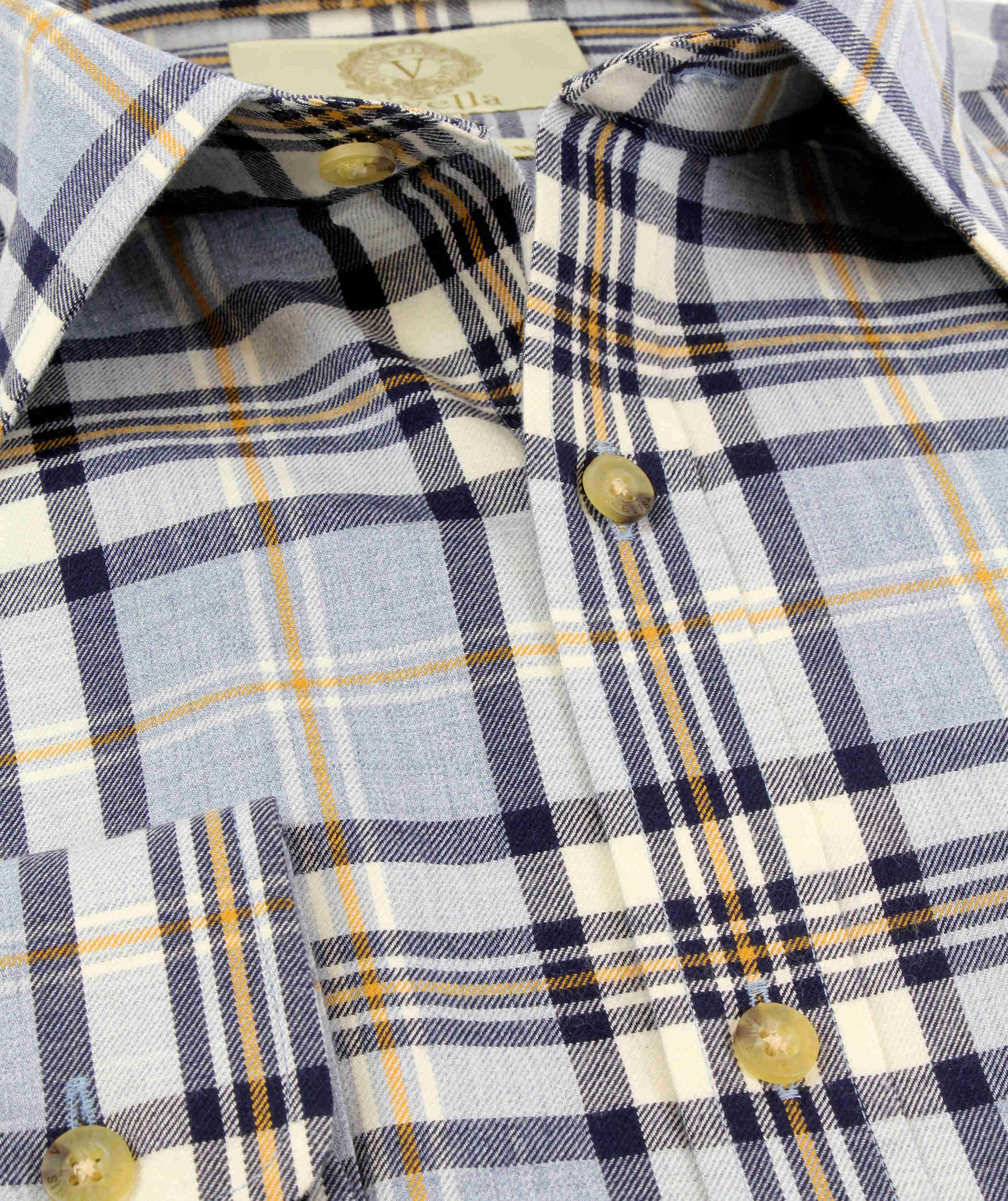 £95.00- Viyella Blue Background with Navy and Tan Plaid Winter Long Sleeve Casual Shirt