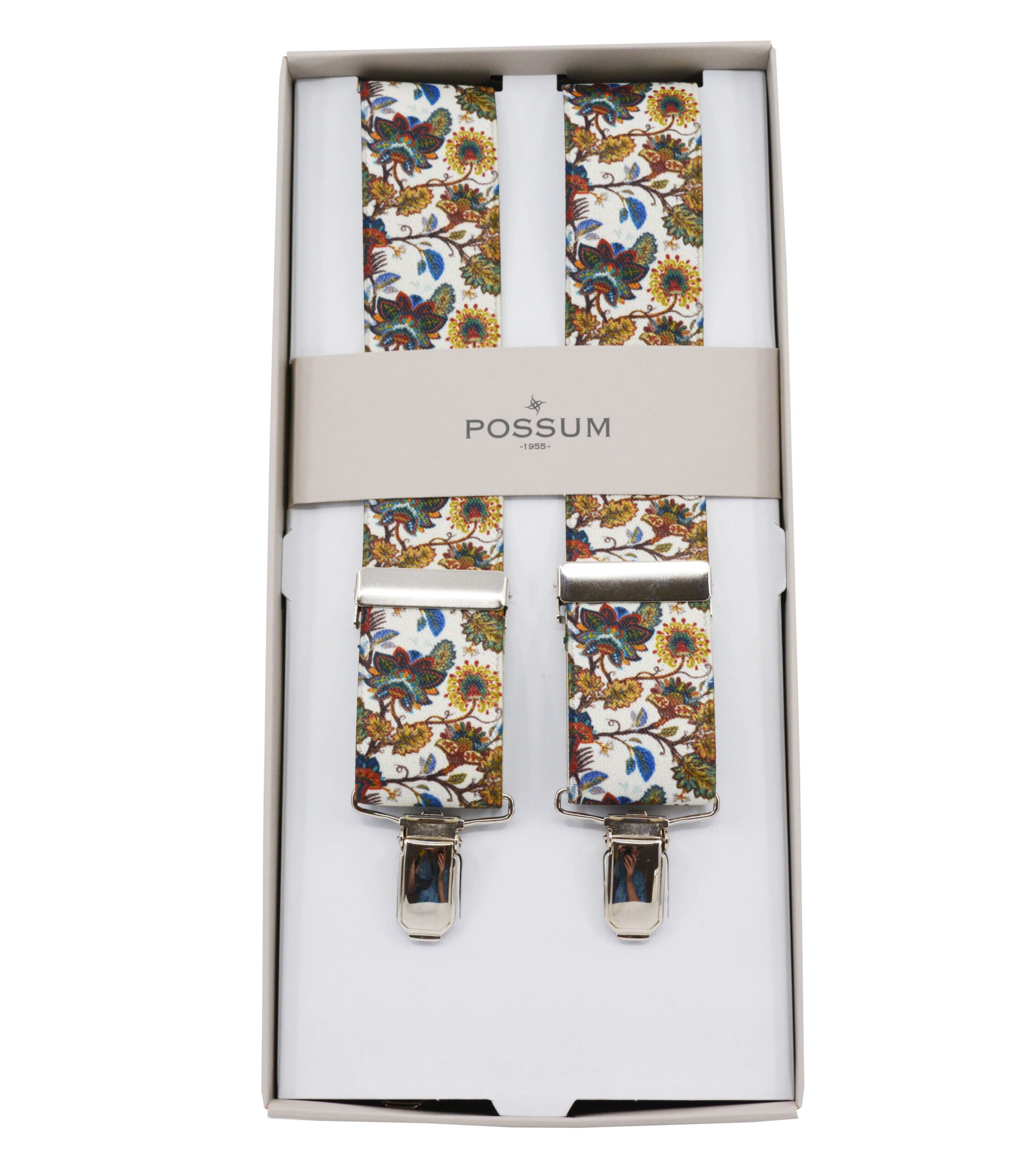Possum. Floral Design Print on an Ecru Ground Adjustable Length 4 Clip Braces for Trousers.