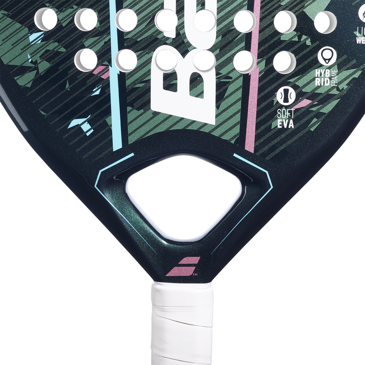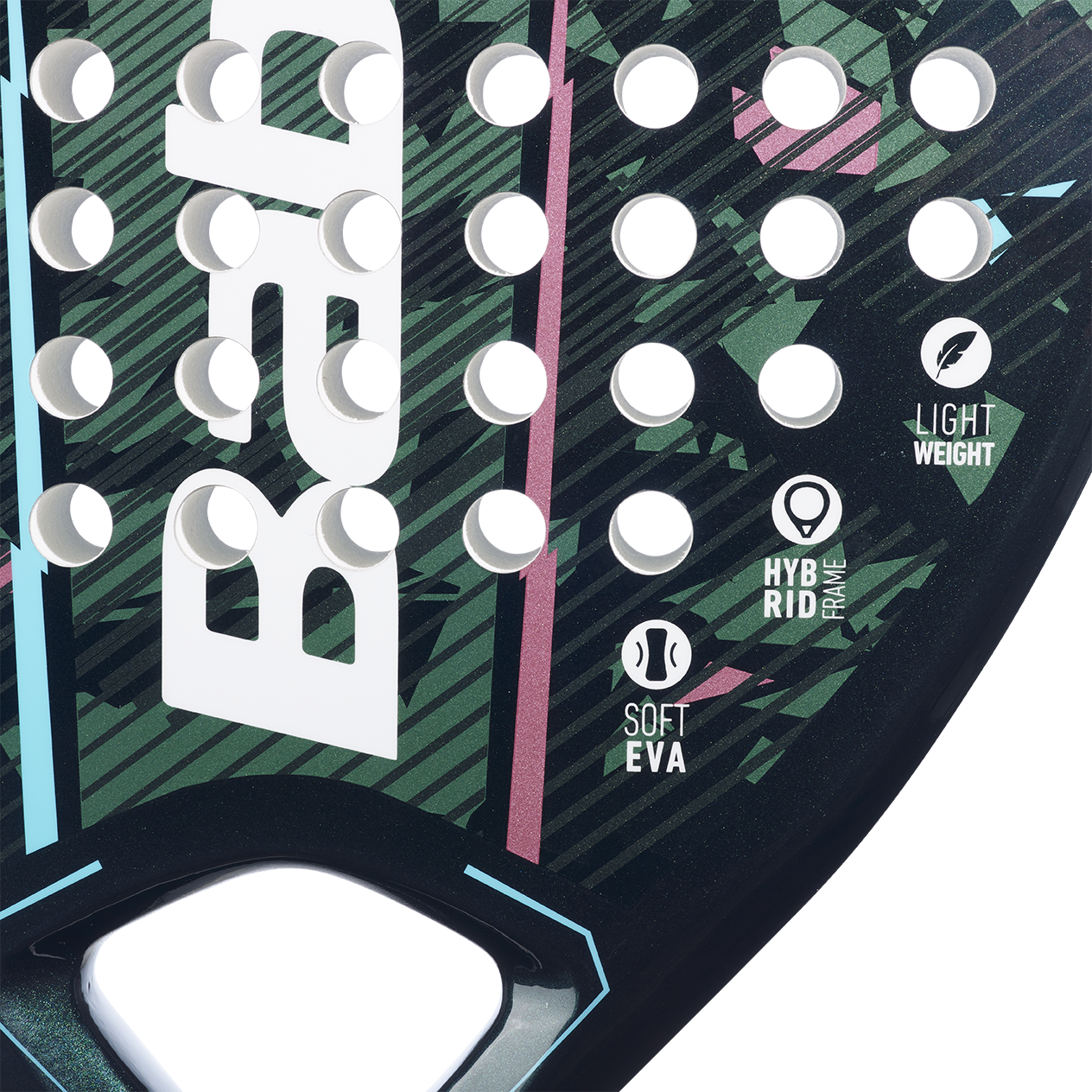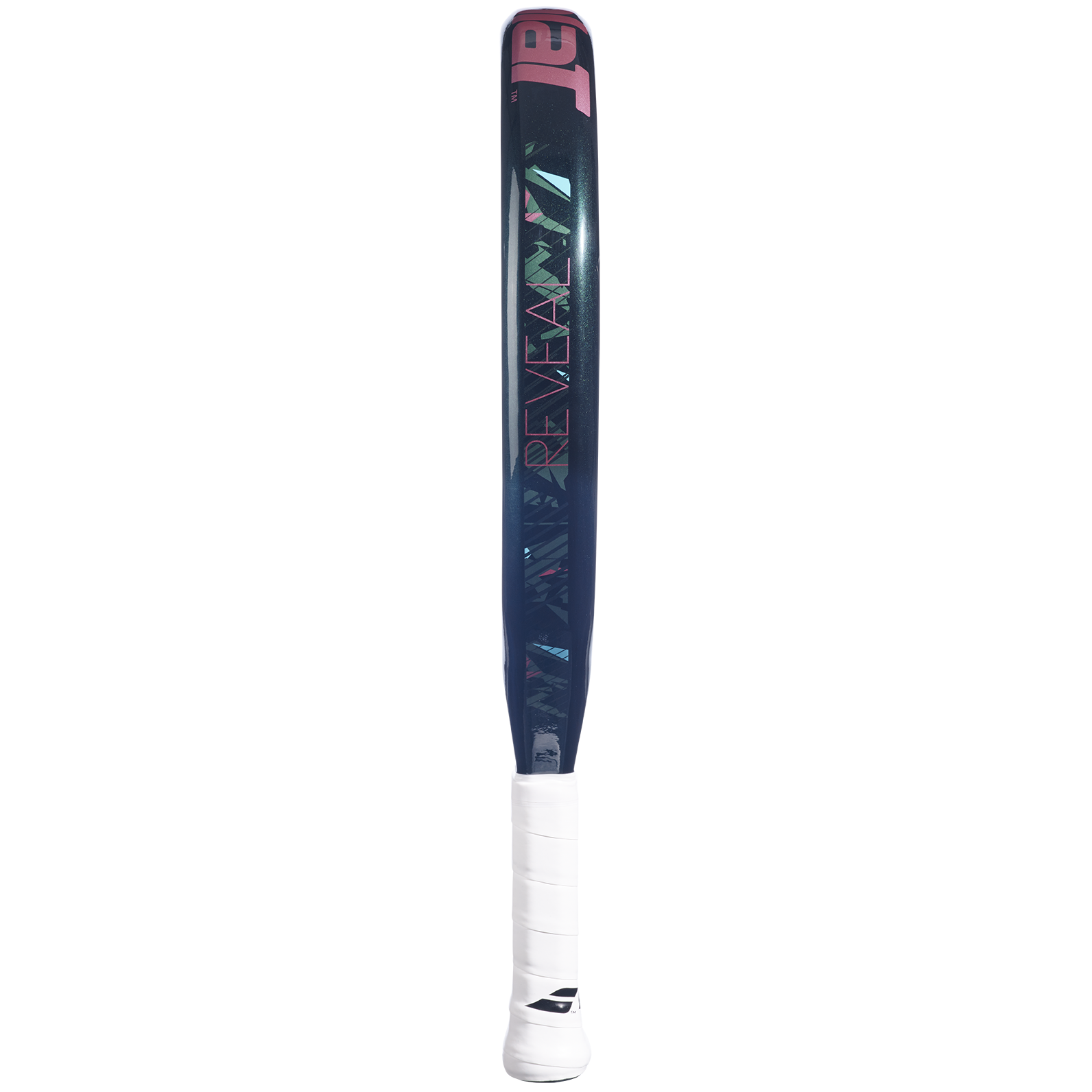 Reveal Padel Racket 340g, 38mm Thickness. Made from a Carbon and fibreglass frame, Fibreglass surface and EVA core.