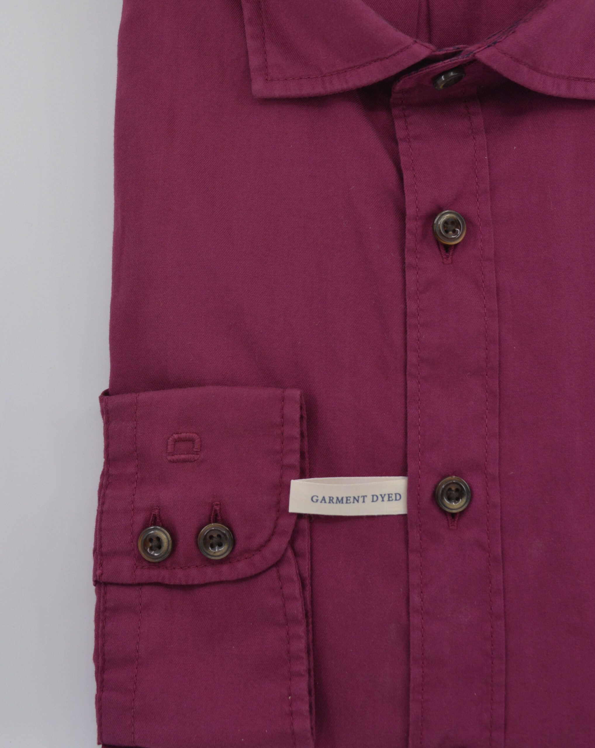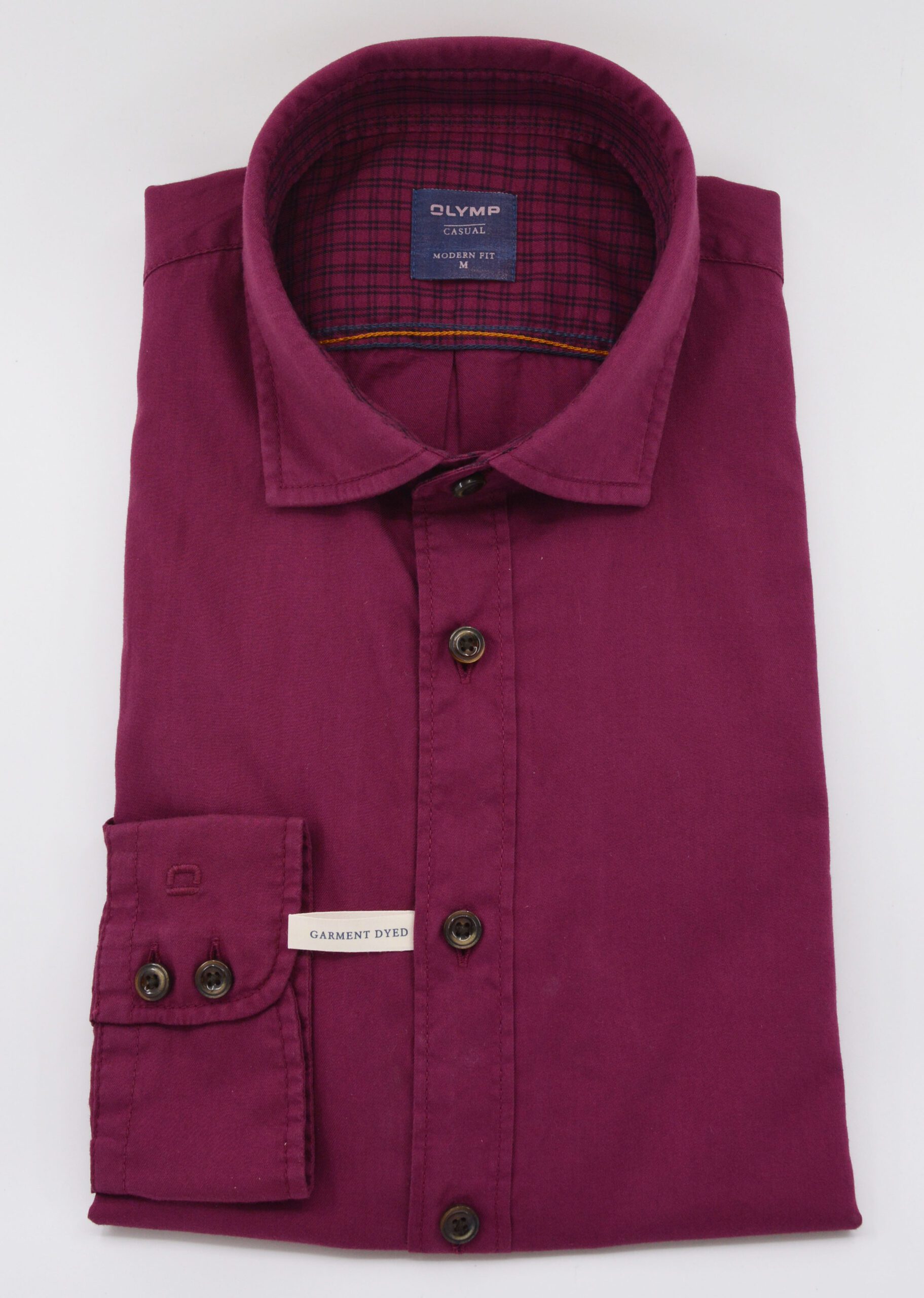 Olymp Casual. Wine Coloured Garment Dyed Pure Cotton Long Sleeve Modern Fit Shirt. Featuring a 2 Button Cuff.