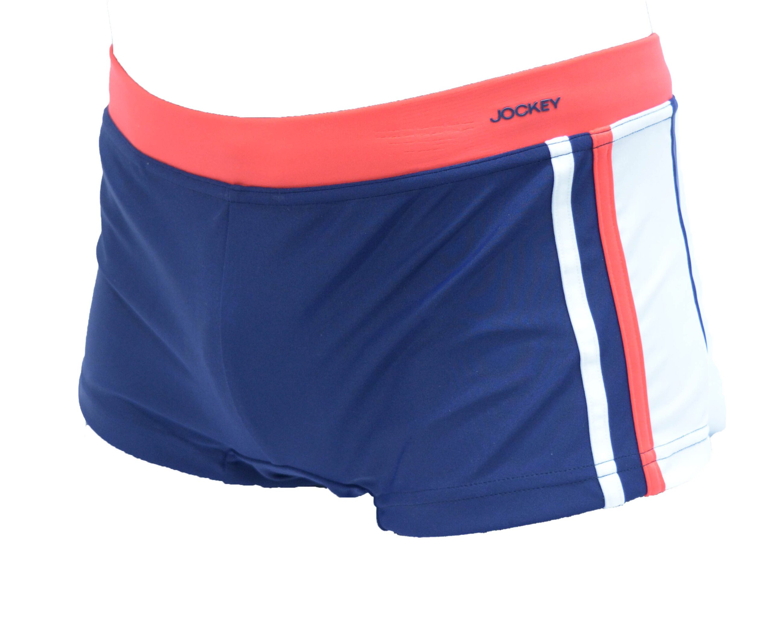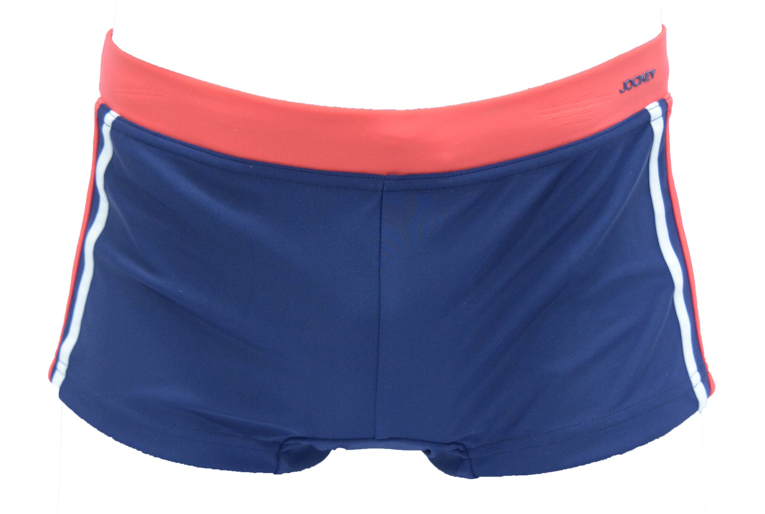 Jockey. Navy Classic Swim Trunks. Deep Side Body with Red Feature Stripes.