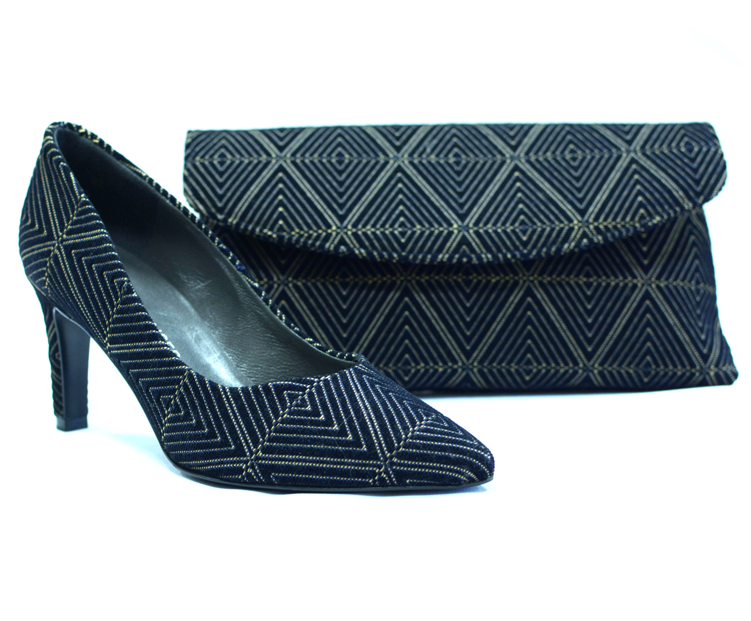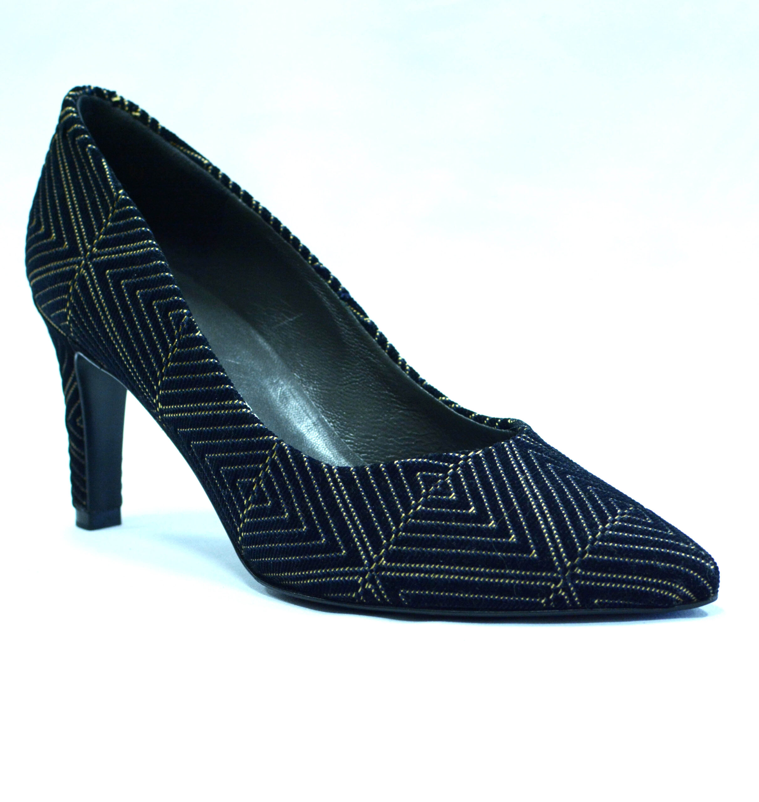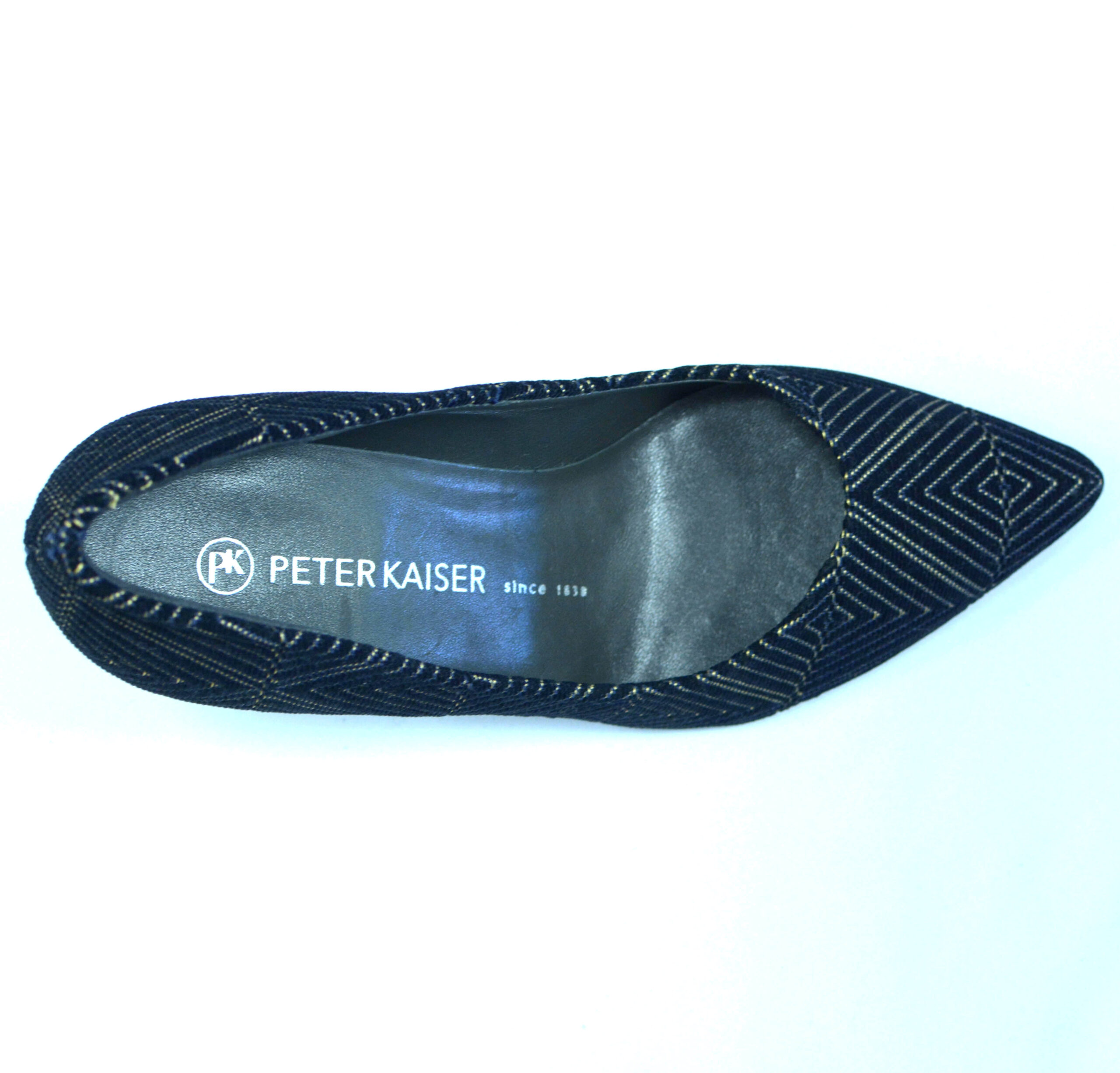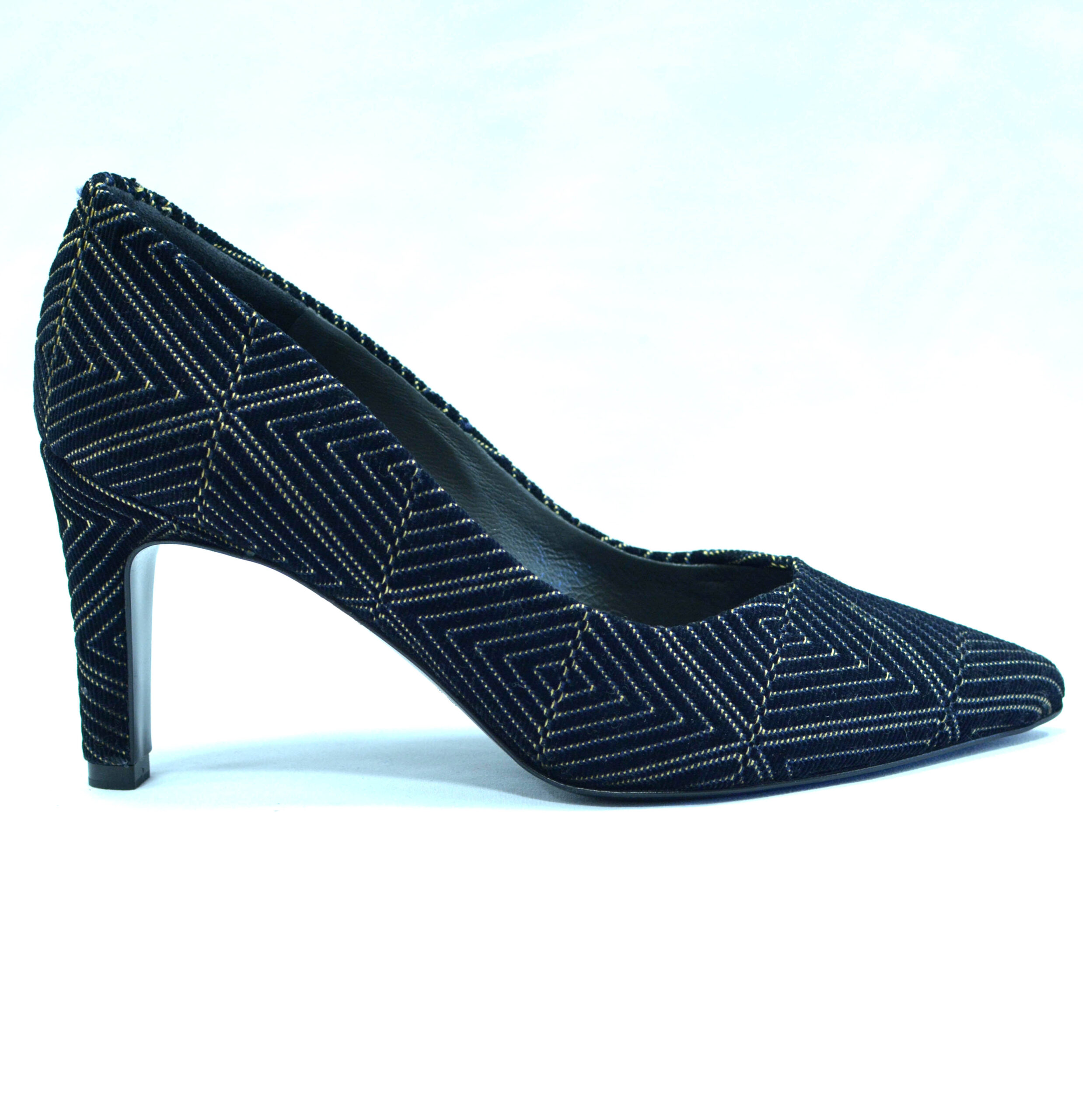 Peter Kaiser. Navy with Embroidered Diamond Design, Mid Height Heel Court Shoe.