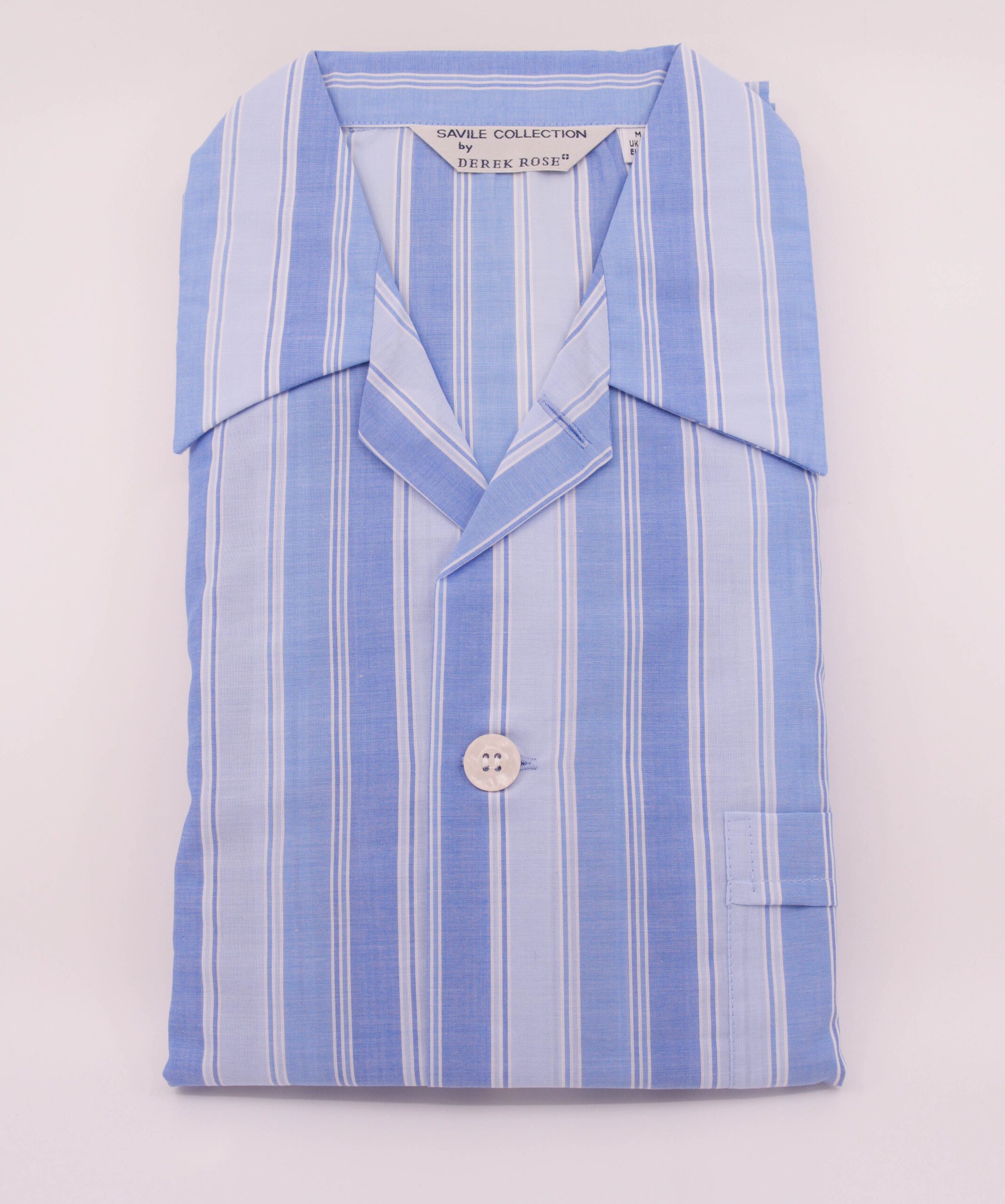 Derek Rose. Savile Collection. Blue Stripe Pure Cotton Lightweight Traditional Pyjamas with a 2 Button and Elasticated Waistband Trouser.