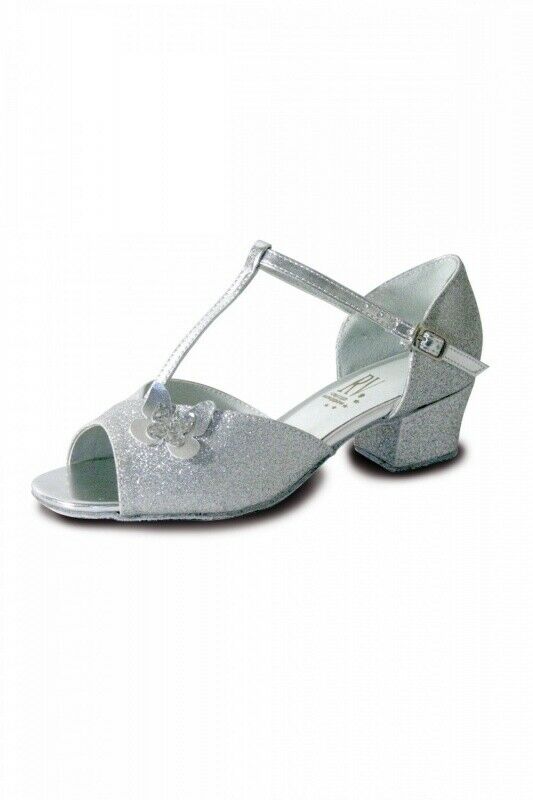 Roch Valley Girls Silver Sparkle Cuban Heel Ballroom Shoe with Butterfly Feature