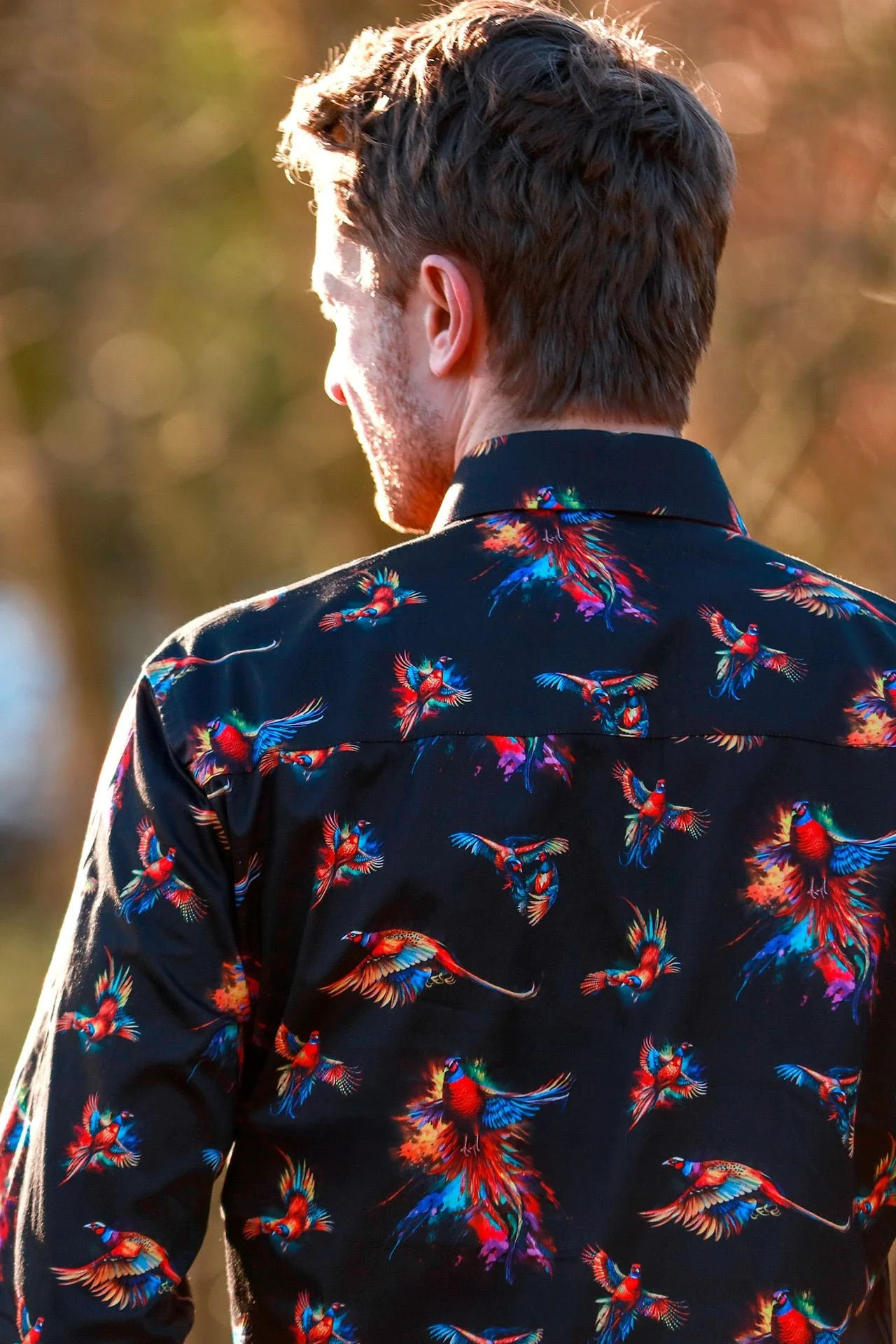 Claudio Lugli Black and Purple Pheasant Print on a Black Background Long Sleeve Cotton Shirt with Toning Buttons