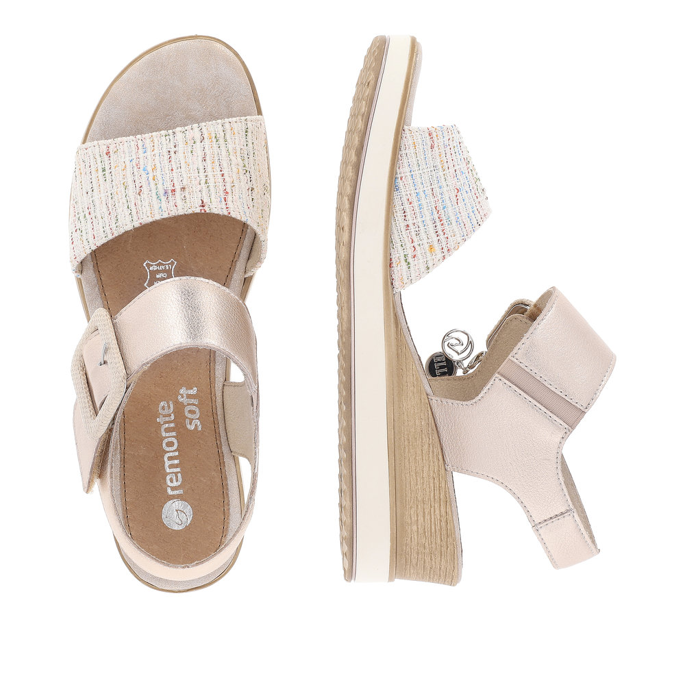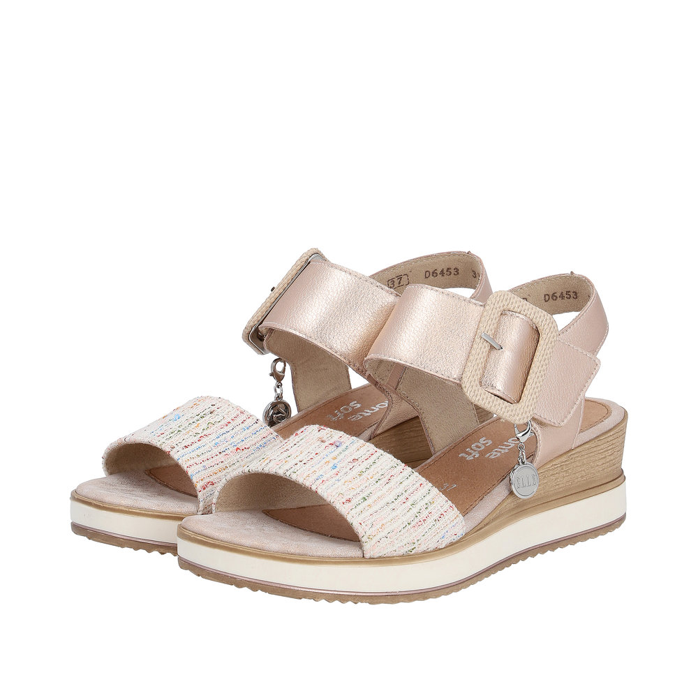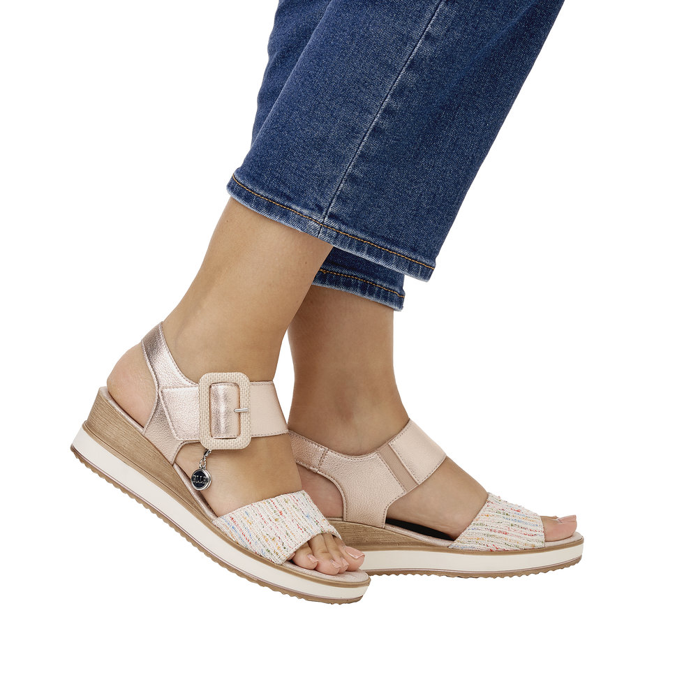 Remonte. Pewter Velcro Buckle Strap Wedge Sandal with Feature Cross Strap.