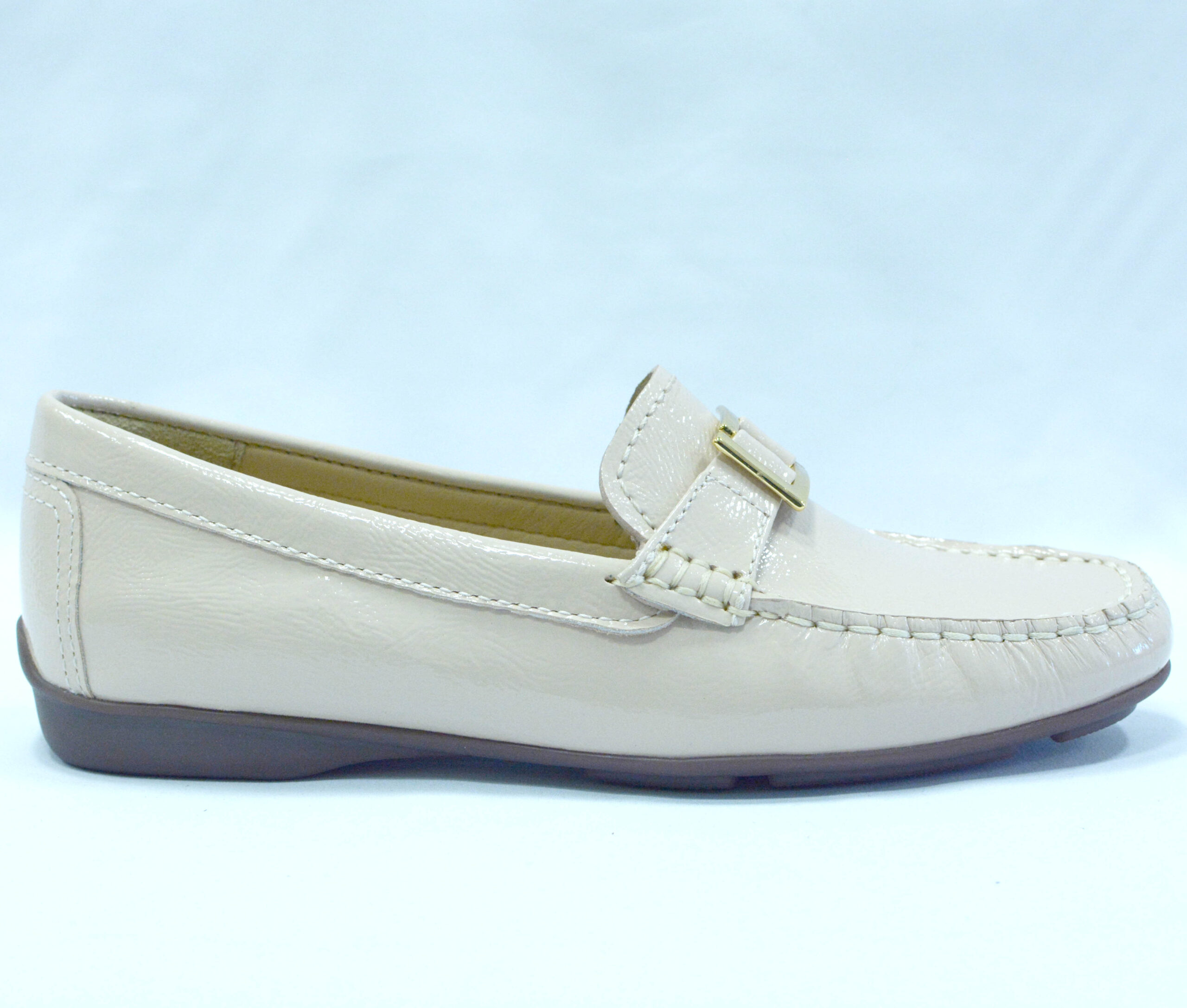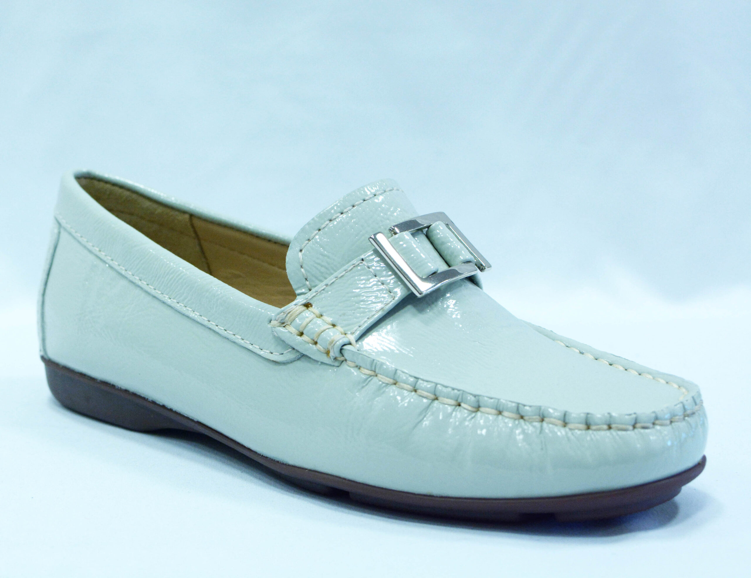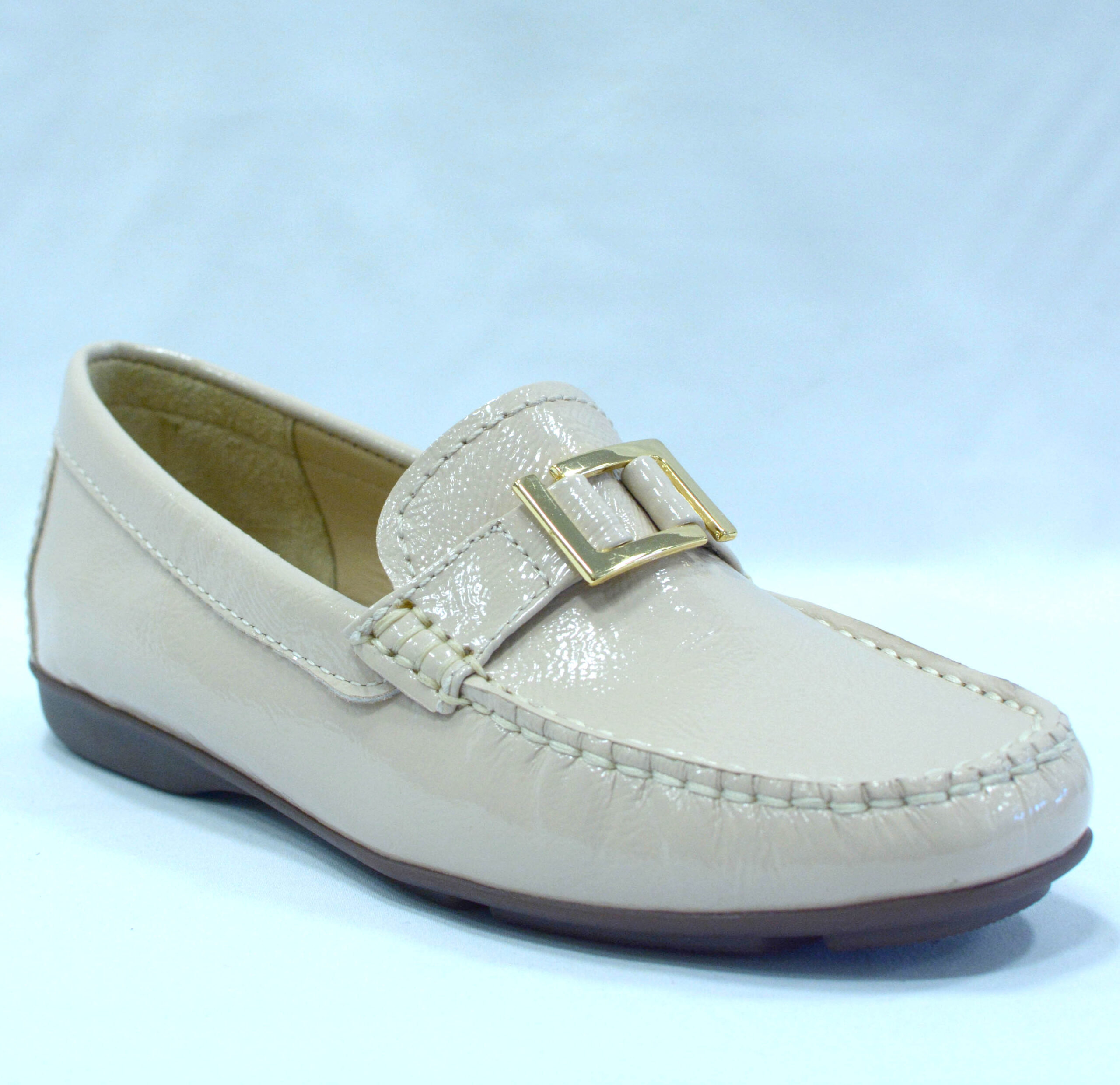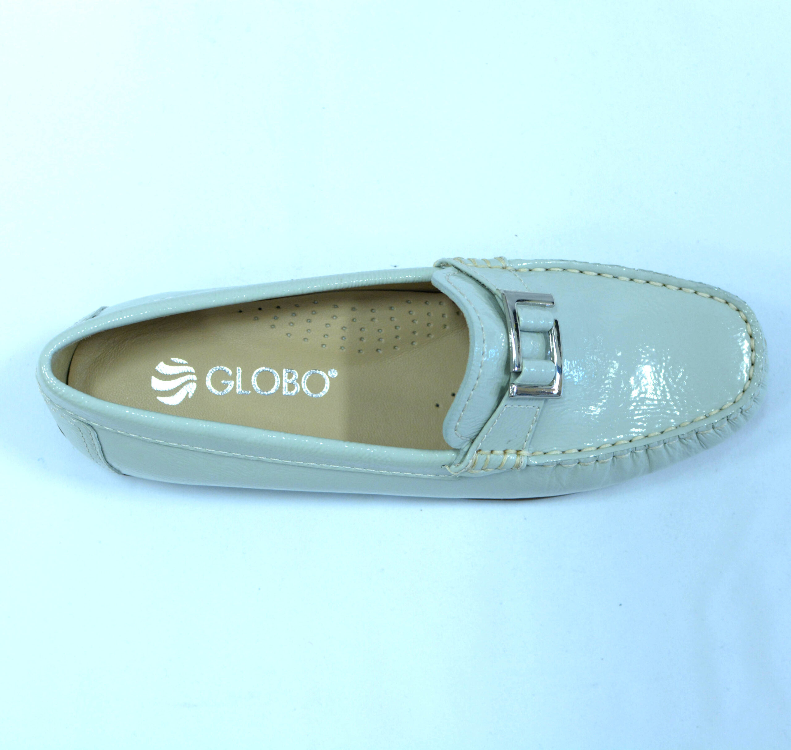 Globo Glastone. Patent Leather. Buckle Fronted, Low Heel, Loafer.