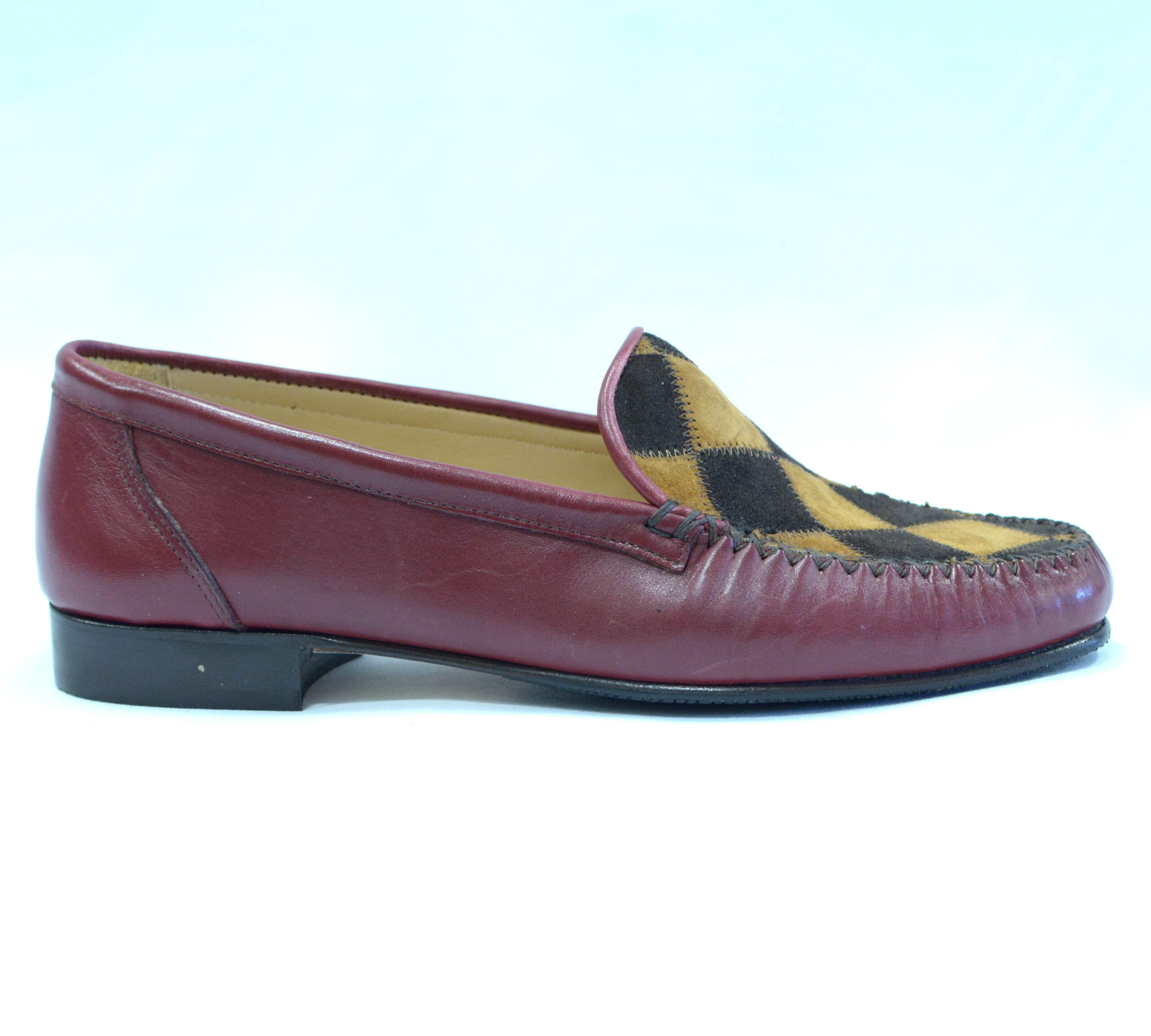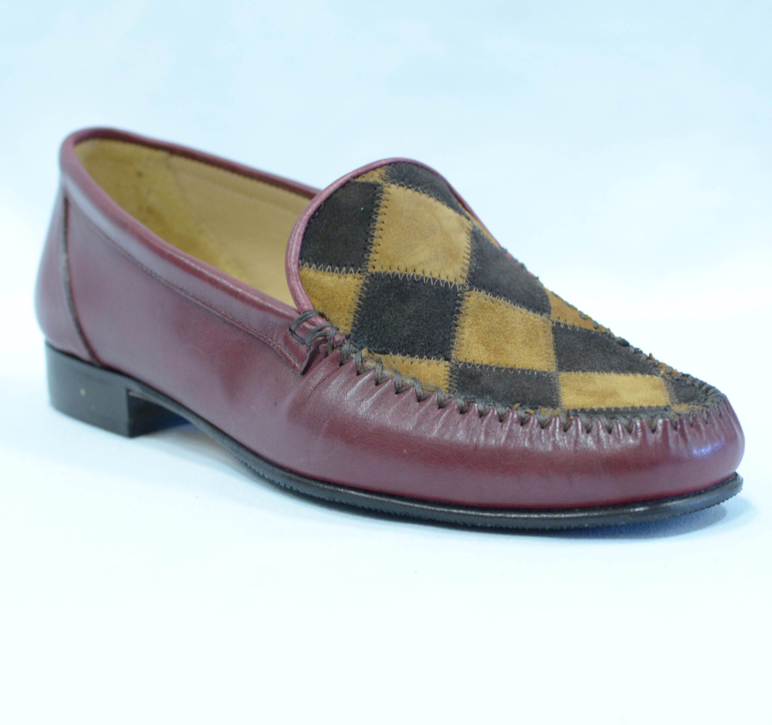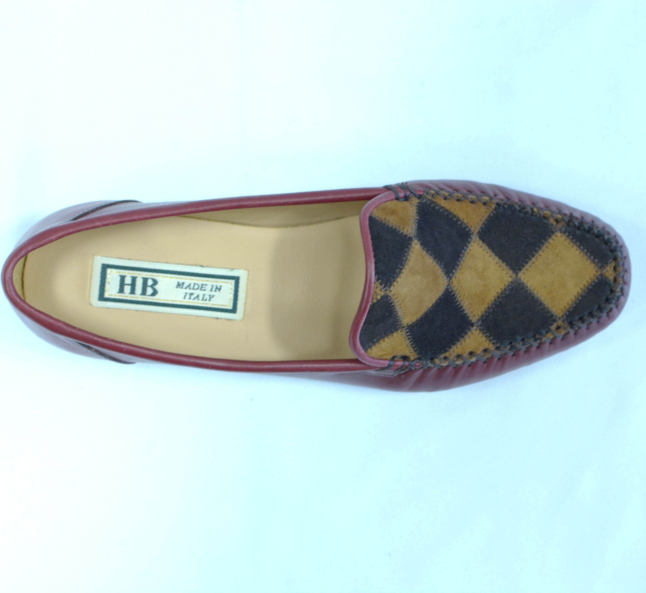 HB Shoes. Italia. Burgundy Leather Loafer Featuring a Suede Harlequin Vamp