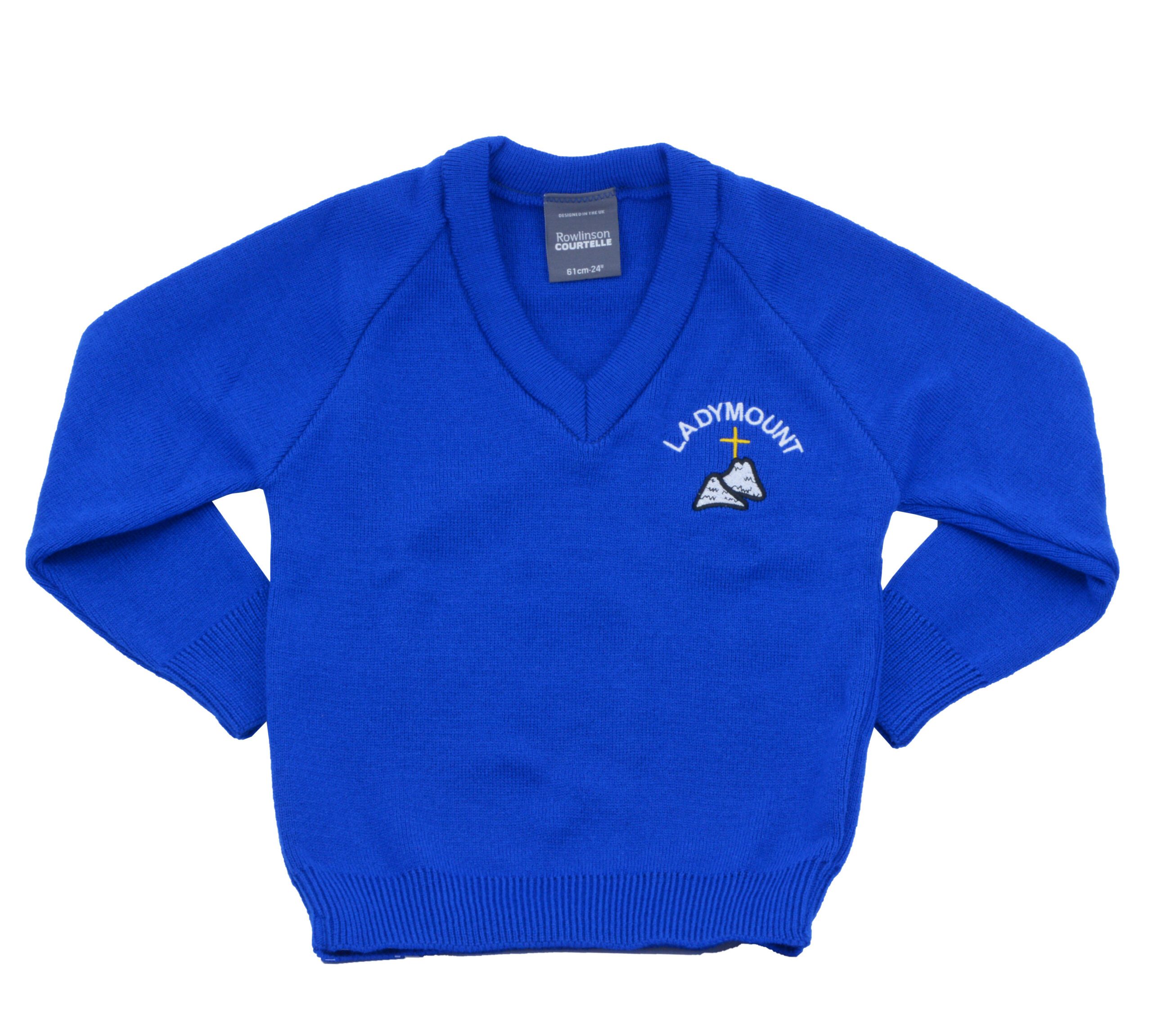 Ladymount Catholic Primary School V-Neck Royal Blue Pullover Embroidered School Badge, Raglan Sleeves, Courtelle Acrylic, Durable.
