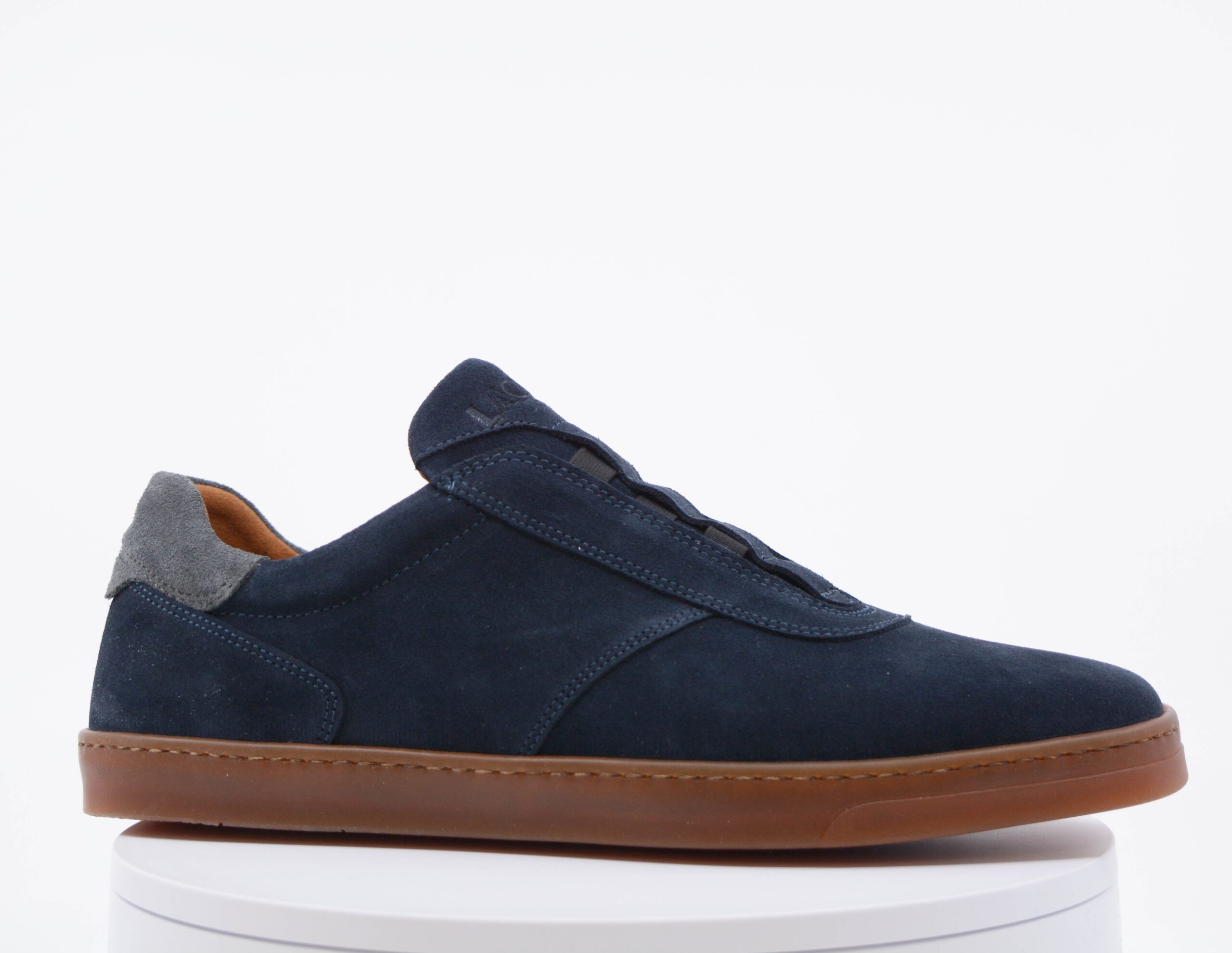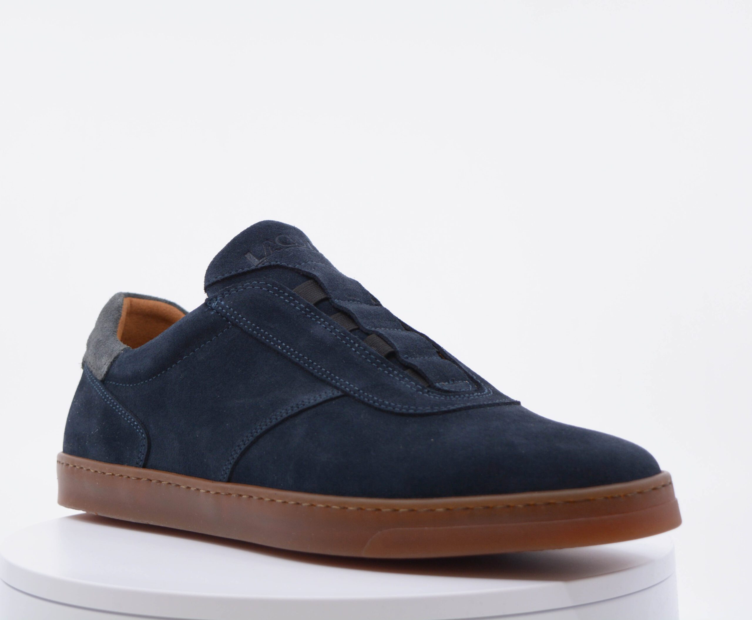 Lacuzzo. Navy Suede Casual Shoe Featuring Hidden Elasticated Fastening. Contemporary shape will compliment both casual and smart looks.