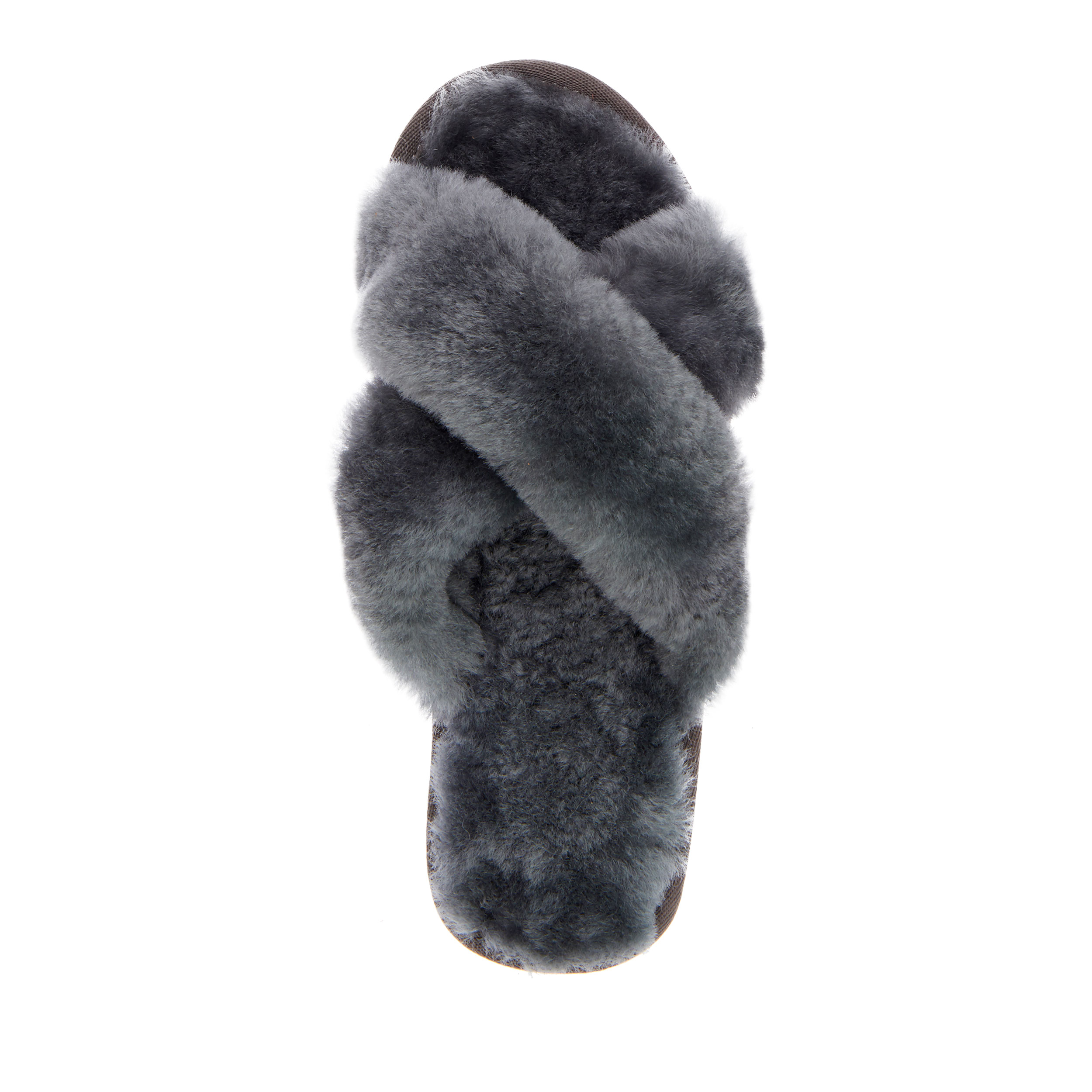 Emu Australia. Charcoal Fluffy Sheepskin Cross Front Rubber Sole Mule Slipper