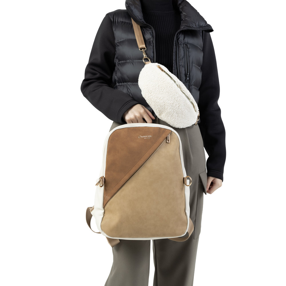 Remonte White and Coffee Backpack with White Furry Detatchable Cross Body Bag