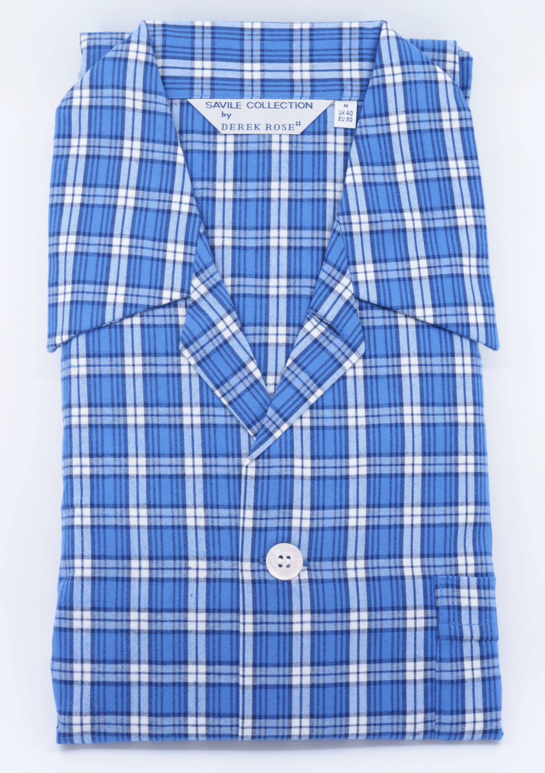 Derek Rose. Savile Collection. Blue Check Brushed Pure Cotton Traditional Pyjamas with a 2 Button and Elasticated Waistband Trouser.
