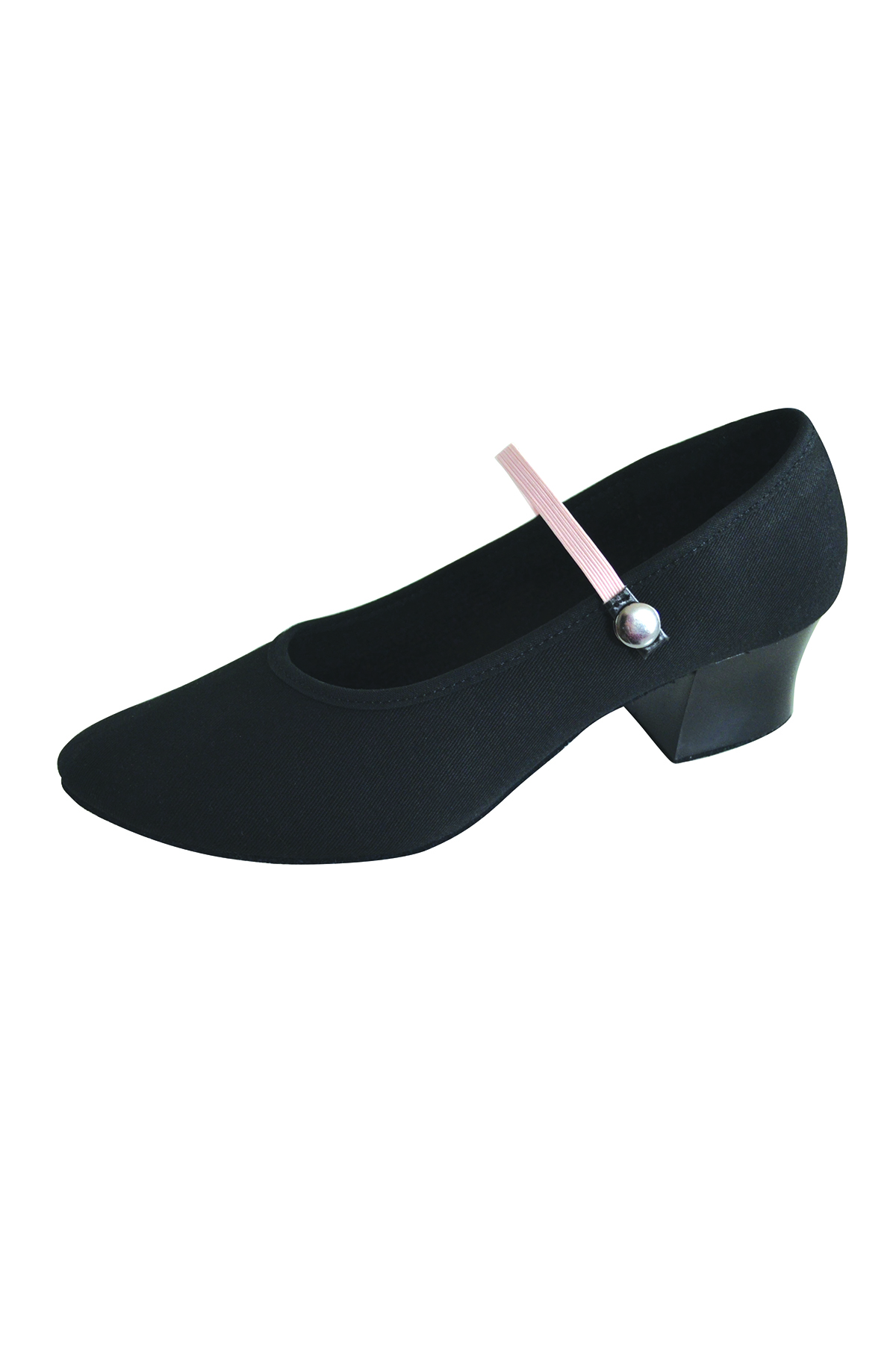 Cuban Heel Black Canvas Character Shoes with Suede Sole Fitted with Pink Elastic and Press Stud.