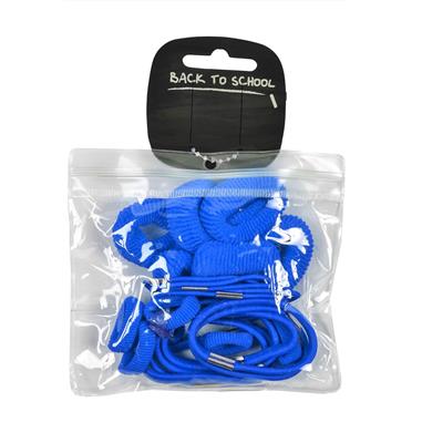 Mixed selection of ponios and elastics in plastic wallet.