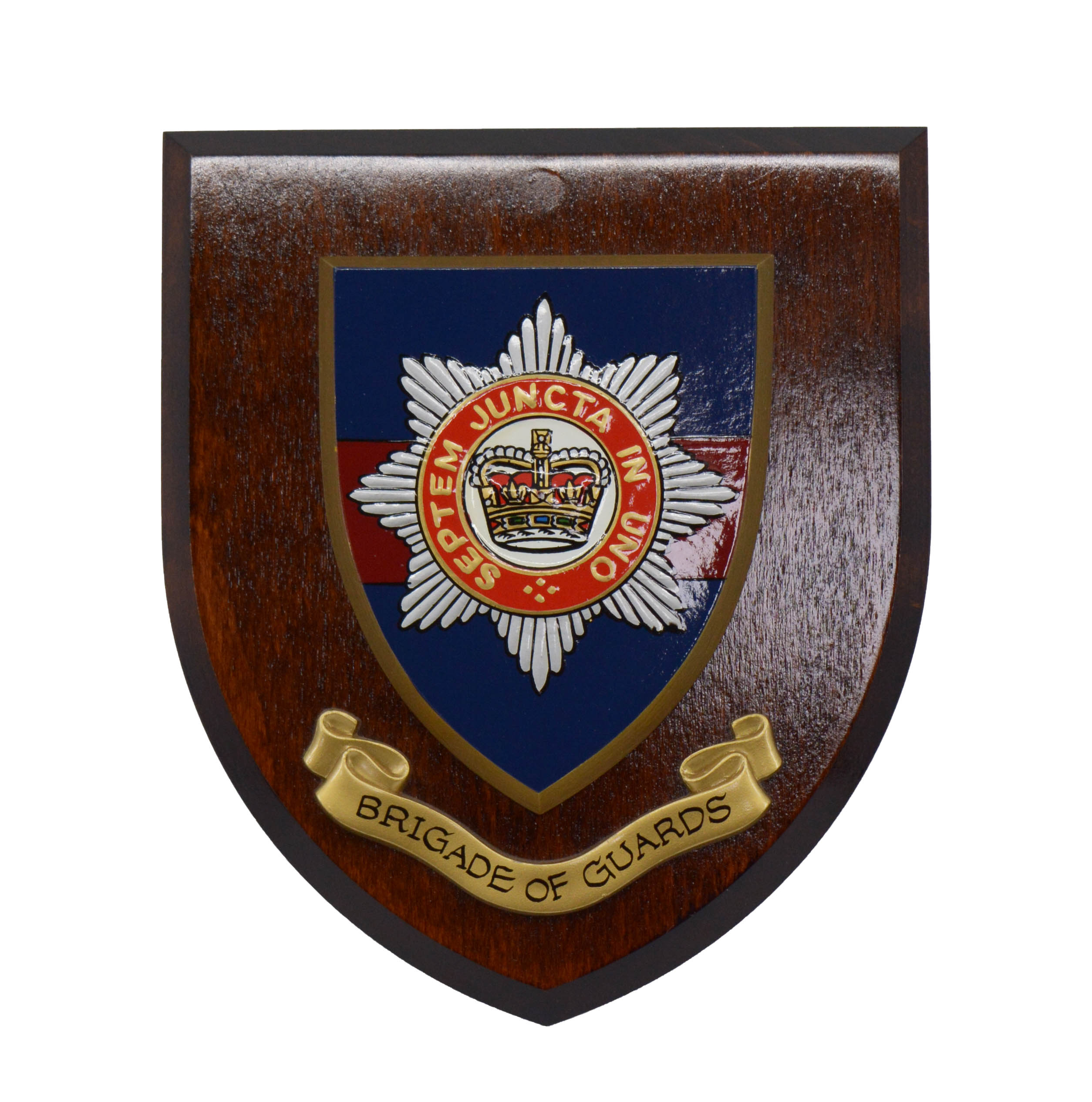 Brigade of Guards Hand Painted Wooden Shield, 7″x6″ Dark Wood Background, traditional design and colours. Made in England.