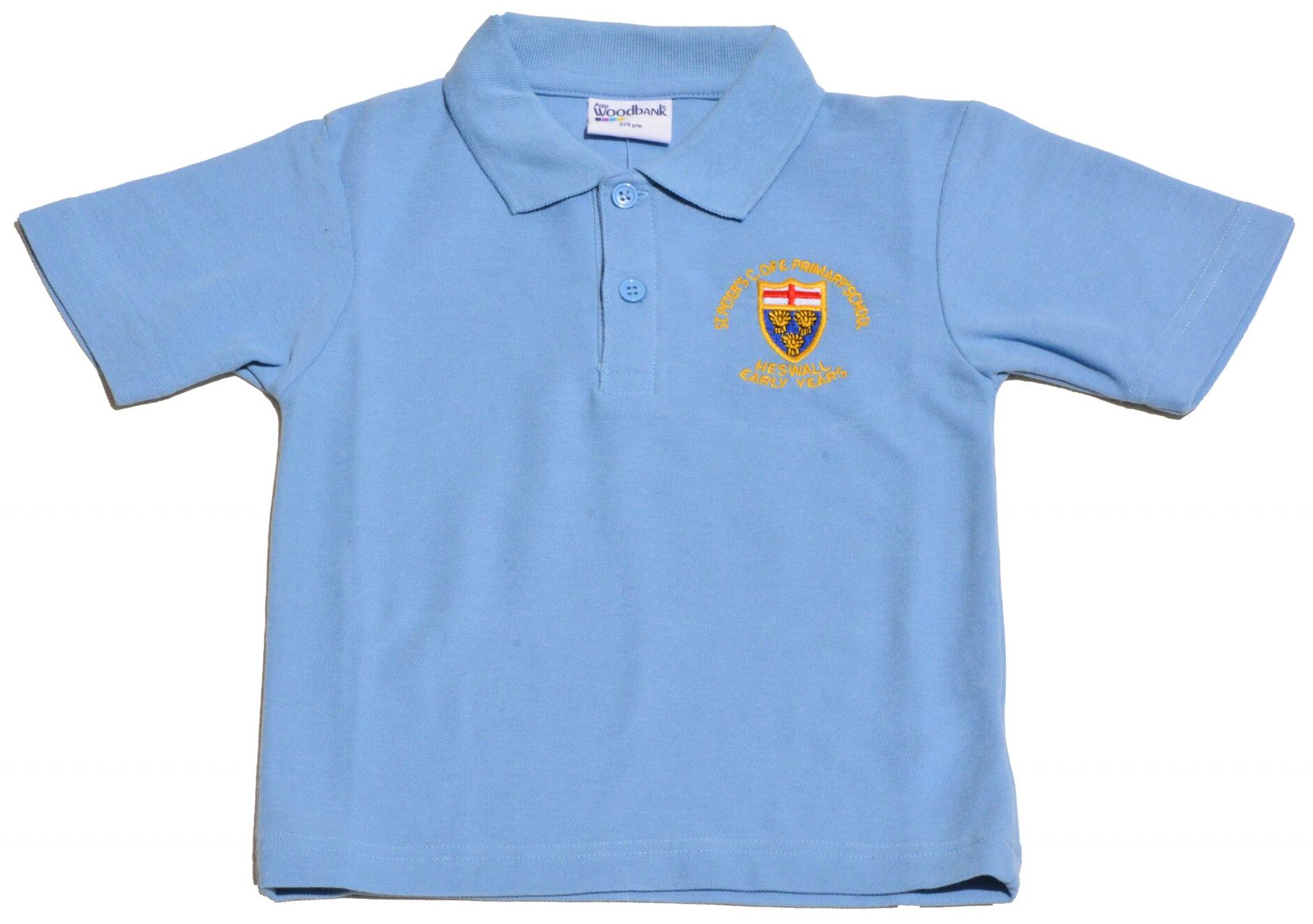 St Peters CofE Primary School Early Years, Sky Blue Polo Shirt, Polyester/Cotton Mix, Flat Knit Collar, Matching Buttons.