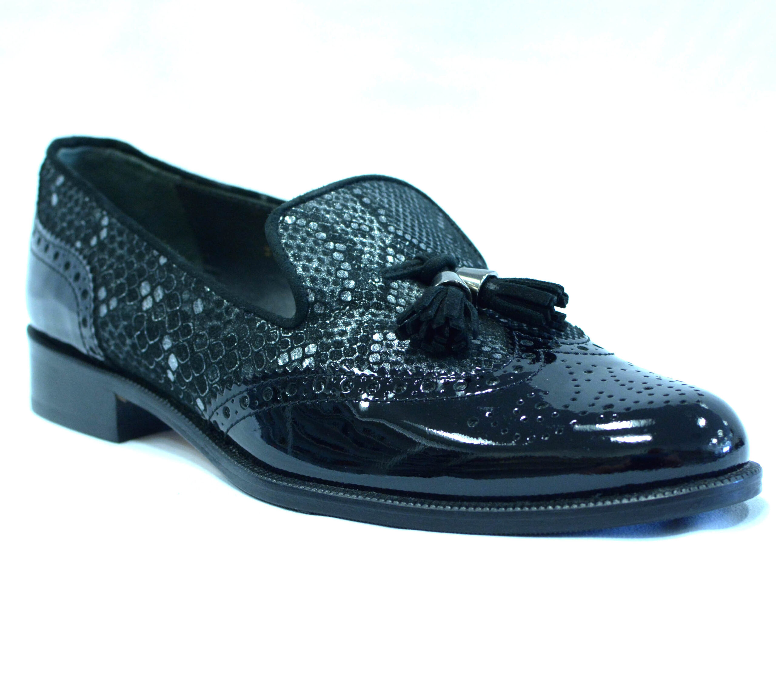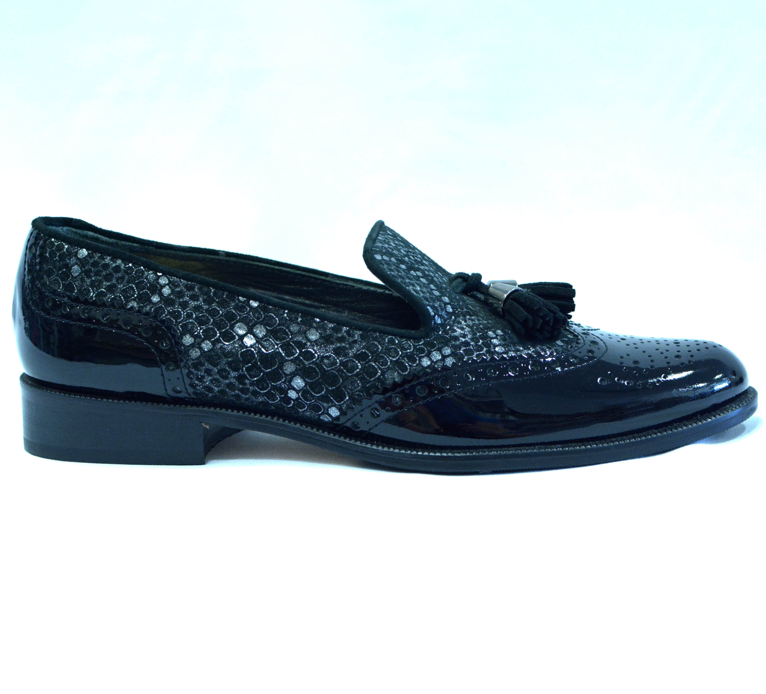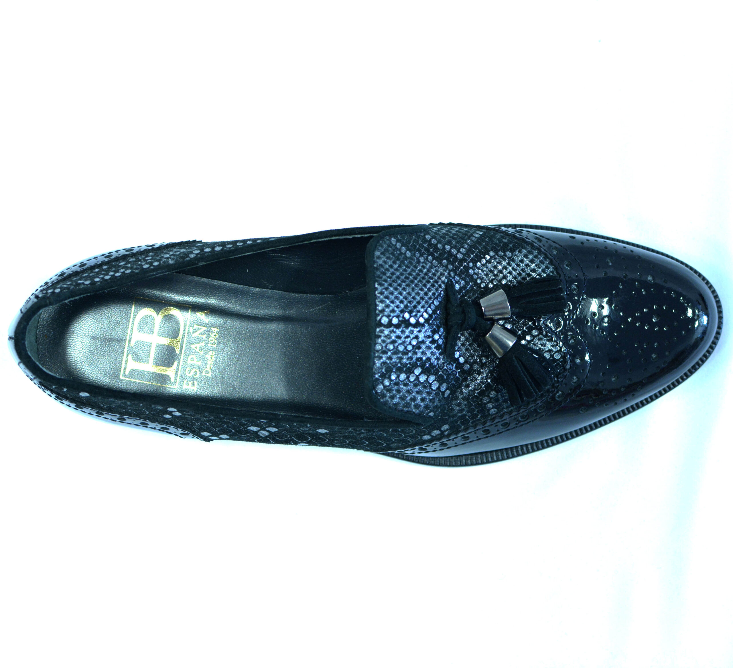 HB Shoes Espana, Feature Material, Brogue Fronted, Low Heel Loafer with a Tassel Detail.