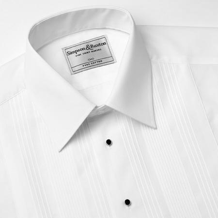 Simpson & Ruxton. Pure Cotton White Pleated Front Evening Dress Shirt with Regular Collar, Removable Studs and a Double Cuff Suitable for Cufflinks.