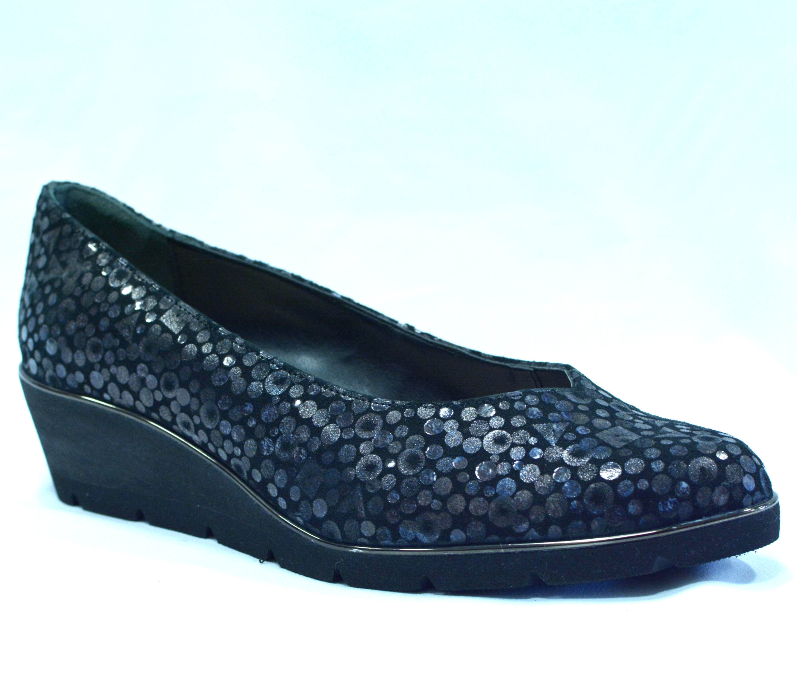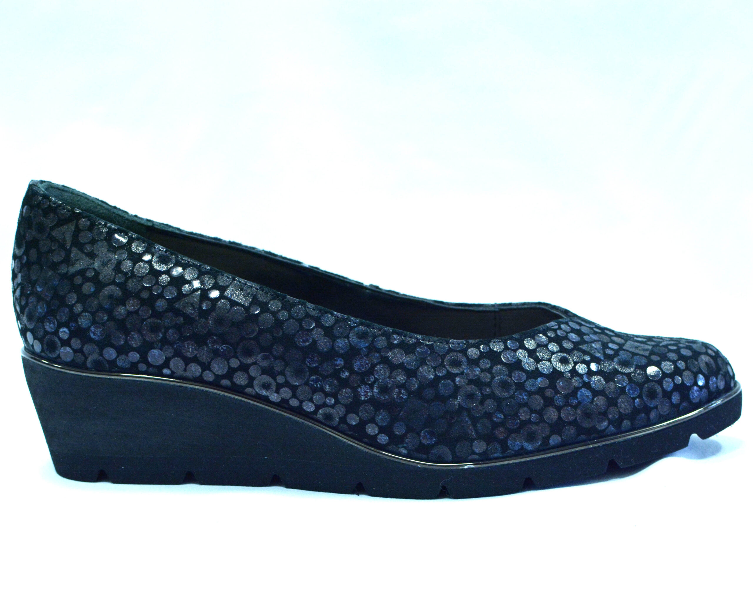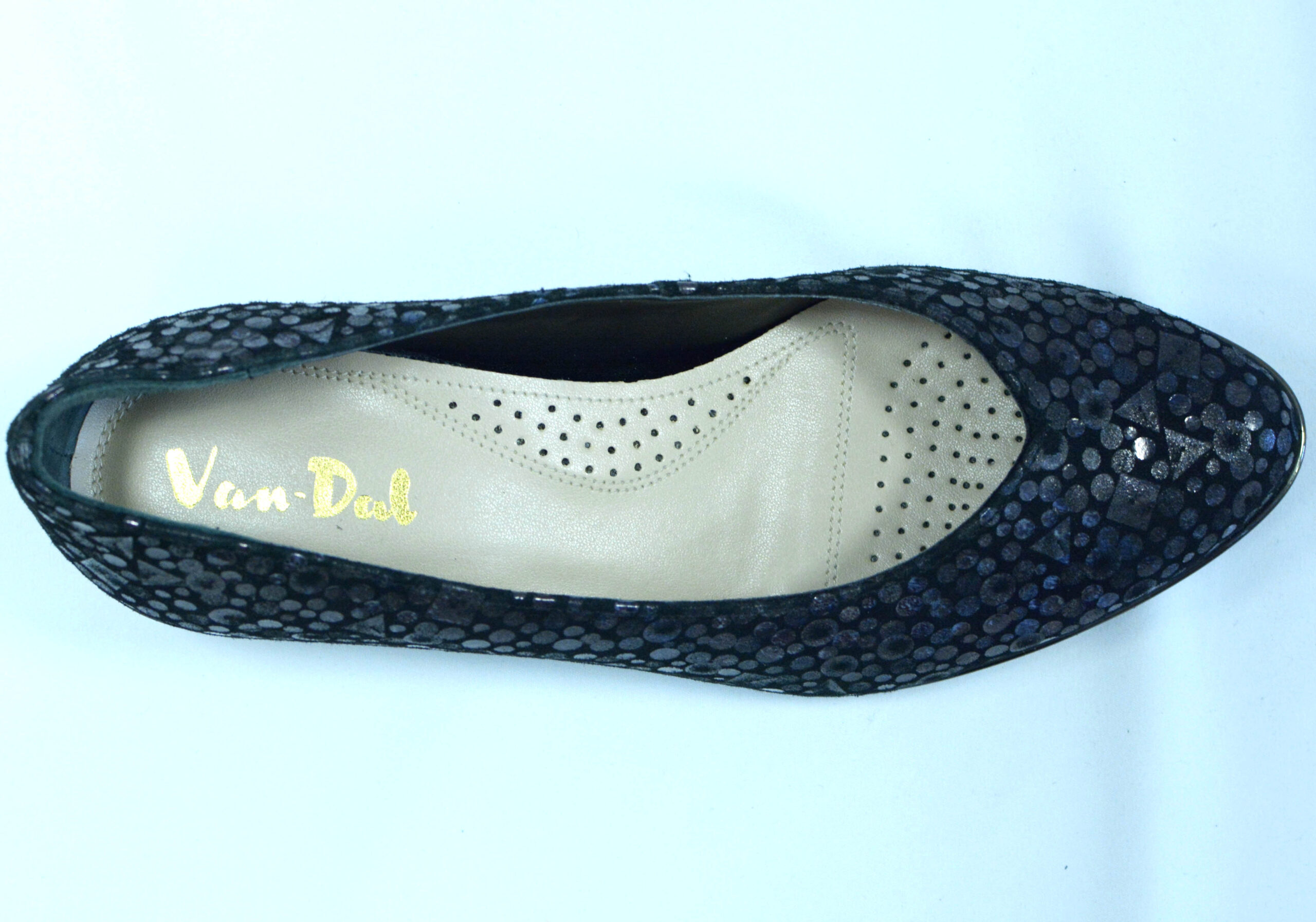 Van Dal. Ariah Black Metailic Printed Finish Suede Wedge Sole Shoe. Fit D