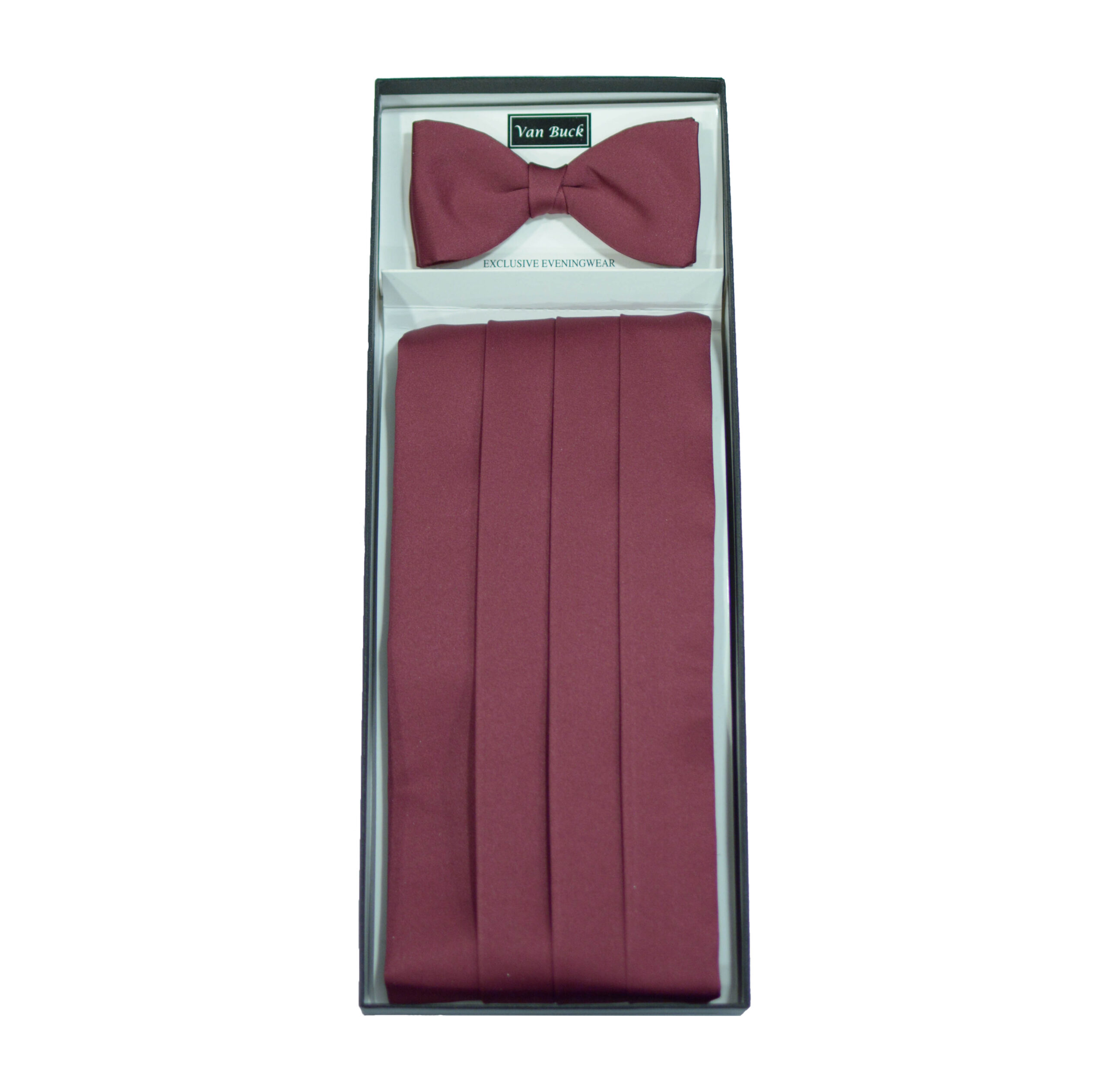 Van Buck. Ready Tied Cherry Polyester Acetate Classic Shape Satin Bow Tie and Cummerbund Set.